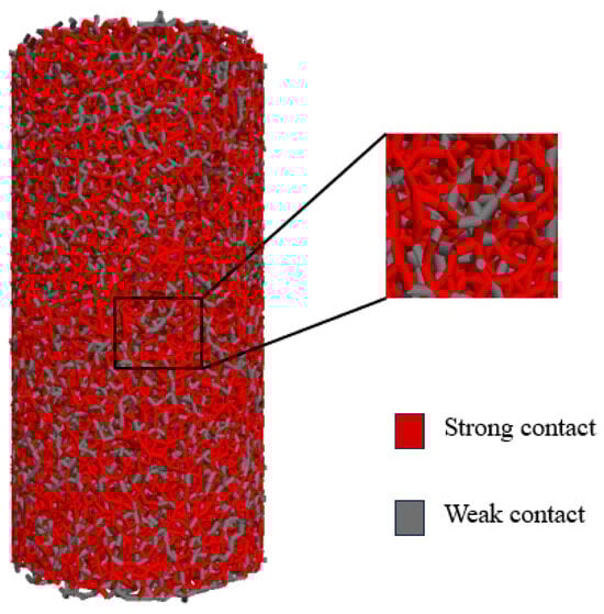 To address the issue of the low compressive–tensile strength ratio in simulating sandstone using the traditional parallel bond model, a strategy involving the random distribution of strong–weak contact groups was introduced, as illustrated in Figure 1. The strong contact group simulates the stronger cementation characteristics between particles. Conversely, the weak contact group is derived from the strong contact group by applying scaling coefficients (modulus ratio RE, stiffness ratio Rk, strength ratio Rσ), thereby simulating the weaker cementation characteristics between particles. This enhanced method more accurately reproduces the heterogeneity within rock, thereby improving the model’s capability to simulate the actual mechanical behavior of rock. The parameter settings for each contact group in the model are presented in Table 1.