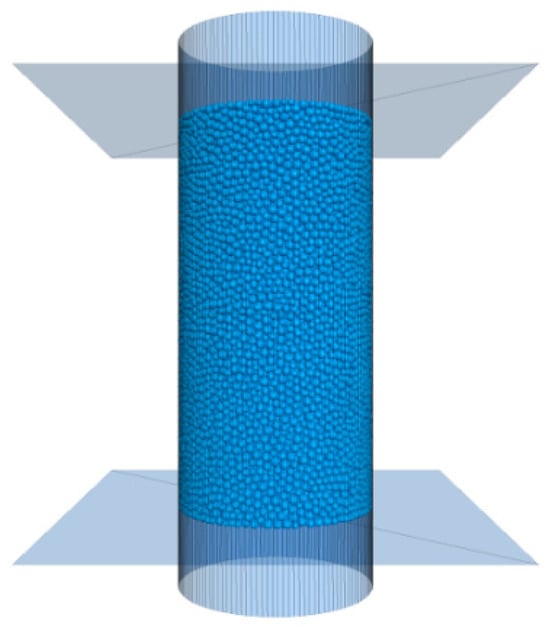 Using PFC3D 6.0 software, a three-dimensional discrete element numerical model of sandstone particles was created. This model featured a standard cylindrical specimen with a diameter of 50 mm and a height of 100 mm. The particle size ranged from 0.8 to 1.3 mm, and the model had a porosity of 0.35, consisting of 30,776 particles. Rigid loading plates were installed at both the top and bottom of the model to apply loads and record the stress–strain curve, as illustrated in Figure 2.