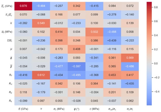 To quantify the linear relationship between microscopic parameters and macroscopic parameters, the Pearson correlation coefficient was utilized for analysis, as illustrated in Equation (3) and the corresponding heatmap in Figure 4.