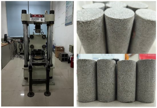 To verify the accuracy and applicability of the improved PBM, a Longhu coal mine sandstone rock sample was selected for compression and tensile strength tests. The testing machine used was a TYJ-2000KN microcomputer-controlled electro-hydraulic servo rock triaxial pressure machine from the Key Laboratory of Ground Pressure Control and Gas Treatment for Deep Mining of Heilongjiang Coal Mines. The experimental equipment and the physical diagram of the rock sample are shown in Figure 5.