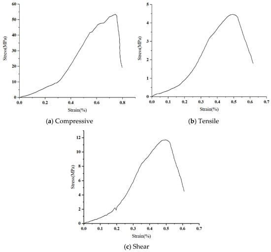 Uniaxial compression, tensile, and shear tests were performed on the rock sample, resulting in the corresponding stress–strain curve (see Figure 6). By analyzing and fitting the curve data, the mechanical parameters of the rock sample were further calculated, with specific data presented in Table 8.