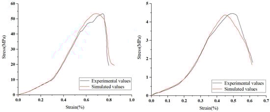 (3) We conducted preliminary PFC simulations using known microscopic parameters. We obtain the corresponding simulation values through uniaxial compression, uniaxial tension, and triaxial compression tests. We compared these values with the experimental values and analyzed the trend in the stress–strain curve. We further adjusted the microscopic parameters to minimize errors. The final values of the microscopic parameters are shown in Table 9.