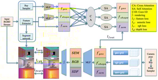 Finally, the global feature is input into the MLP network, which decodes it to generate semantic labels, RGB colors, and geometric densities, respectively. The semantic labels are used to represent the semantic information of the scene, the RGB colors are used to represent the appearance of the scene, and the geometric densities are used to represent the geometric structure of the scene.