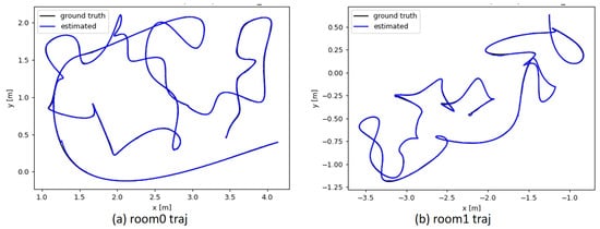 As shown in Figure 2, we selected two rooms from the Replica dataset to conduct camera pose trajectory experiments. The trajectory represents the camera’s movement path in the environment, which is a crucial indicator for evaluating the positioning accuracy of the SLAM system. We aim to evaluate the accuracy of the proposed method in obtaining the camera pose trajectory. In the experiment, the blue line represents the trajectory obtained by our Sem-SLAM, and the black line represents the ground truth trajectory. The results show that the trajectory obtained by our method highly coincides with the ground truth trajectory, which effectively verifies the effectiveness of introducing the multi-scale information extractor to extract both coarse-grained and fine-grained information of the camera pose. With the help of this innovative structure, relevant trajectory information can be accurately captured, making the trajectory estimation approach the true value.