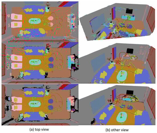 In addition, we carried out a multi-view semantic mapping experiment for the same room. As shown in Figure 3, throughout the mapping process, relying on the full-attention cross-modal feature fusion mechanism, our algorithm can efficiently integrate the geometric, shape, and semantic features extracted by the cross-attention and self-attention modules. By fully exploiting the complementary advantages of features at various levels, the algorithm is able to accurately capture the subtle structures and semantic attributes of objects in the scene.