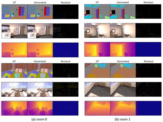 Finally, we conducted a detailed comparative experiment on semantic modeling across two rooms, as illustrated in Figure 4. By juxtaposing the generated semantic images with their ground truth counterparts, we observed a striking resemblance between them. Our algorithm, empowered by the multi-scale information extractor and full-attention cross-modal feature fusion approach, excels not only in accurately reconstructing semantic information at a holistic level but also in meticulously capturing fine-grained details.