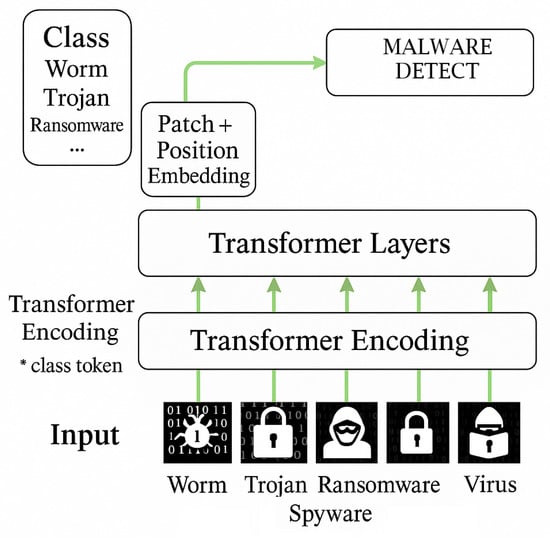 Figure 2) the asterisk (*) in the image indicates that the Transformer Encoding module includes a class token, a special vector added at the beginning of the input sequence that does not represent specific malware data but serves as a global summary. This token enables the model to generate an aggregated representation of the entire input, which is subsequently used for malware classification and detection. Then, Patch and Position Embeddings are applied to segment and position the data. The Transformer Layers process these representations with self-attention, enabling the identification of patterns.. These models leverage self-attention mechanisms to capture global dependencies in data and have demonstrated strong performance in malware detection scenarios when trained on large datasets [