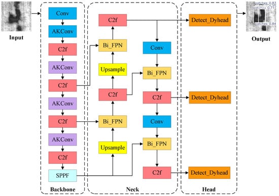 As depicted in Figure 1, YOLO-MAD implements comprehensive enhancements across the original YOLOv8n architecture’s backend, neck, and head components. The AKConv module employs deformable convolution operations to better characterize minute and geometrically complex defects. The BiFPN module, through its multi-scale bidirectional fusion mechanism, markedly improves the efficiency of information interaction between disparate feature levels. Furthermore, Detect_DyHead incorporates a multi-dimensional attention mechanism, which in turn boosts the detection head’s responsiveness to crucial regions and refines its task decoupling capabilities. These architectural innovations collectively achieve superior detection precision with minimal computational burden.
