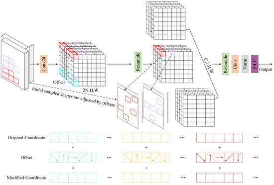 Here, k specifies the count of sparse sampling locations.  incorporates learned spatial offsets, with  being derived through deformable convolution operations.  indicates the self-learned importance of that position. Both are adaptively generated from the intermediate feature representations of the input tensor .