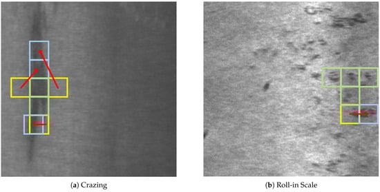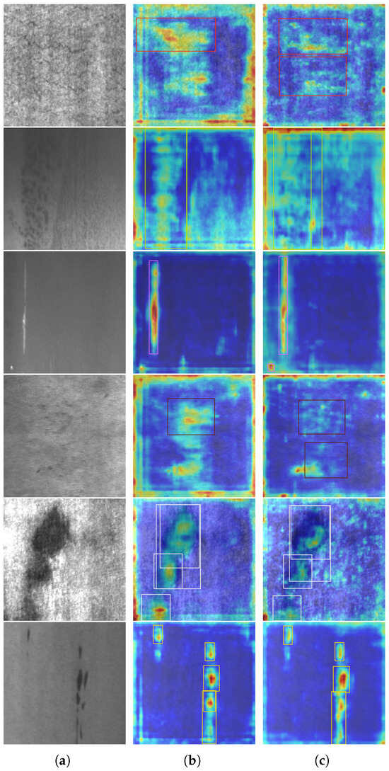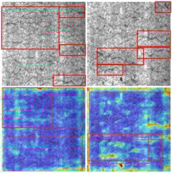 Nevertheless, the performance of YOLO-MAD remains limited in CR and Cr categories. These defects often exhibit weak contrast and lack distinct structural patterns (as shown in Figure 15), making them visually similar to the background. As shown in the Grad-CAM visualizations (Figure 14), the attention responses for these categories are scattered or misaligned, indicating that the model struggles to focus on the relevant areas []. Future enhancements such as saliency boosting, contextual encoding, or multimodal guidance could improve the model’s ability to distinguish low-saliency defects.