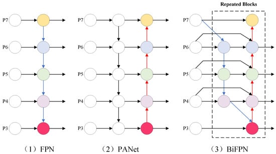 Steel surface defect detection often varies significantly in size and morphology. Unlike objects in natural images with strong semantic consistency, steel surfaces can have diverse defect types like minute cracks, large oxidation spots, and irregular indentations. This multi-scale heterogeneity significantly increases the challenge of feature representation for detection models. While the PANet structure in the original YOLOv8 offers some cross-layer feature fusion capabilities and outperforms traditional FPN, its linear weighting scheme cannot fully model the relative importance of features at different resolutions. This fusion approach risks suppressing high-level semantic features by excessive low-level detail representation, while potentially allowing large-scale features to dominate the integrated output, consequently degrading detection performance for small objects. To tackle this, we replace YOLOv8’s original module with BiFPN. The schematic representations of FPN, PANet, and BiFPN network architectures are shown in Figure 5. By integrating BiFPN, we achieve adaptive feature selection and information enhancement, thereby improving overall detection accuracy [].