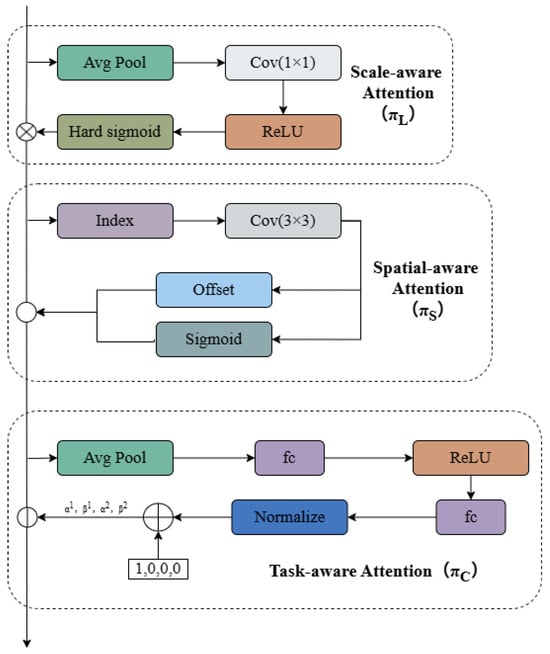In industrial defect detection tasks, the static fusion strategies of traditional detection heads struggle to adapt to the complex characteristics of defect targets. For instance, micron-level scratches require high-resolution features for precise localization, while randomly distributed point defects necessitate robust spatial context modeling. Furthermore, conventional classification–regression shared convolutions often lack task-specific feature decoupling, leading to semantic confusion within the detection head against noisy backgrounds. To mitigate the aforementioned problems, this paper integrates the Detect_DyHead, built upon a three-dimensional decoupling attention structure. As shown in Figure 6, Detect_DyHead achieves efficient collaboration across multi-scale and multi-task aspects in object detection through multi-task decoupling branches and a fine-grained dynamic router. By introducing a self-attention mechanism, Detect_DyHead decomposes the feature tensor into three orthogonal dimensions—level, space, and channel—to construct a cascaded dynamic attention module. This design enhances the model’s sensitivity to fine-grained defect regions while also reinforcing the synergistic optimization between classification and regression tasks, thereby boosting its effectiveness in handling complex industrial defect detection scenarios [].