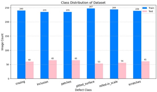 Our investigation primarily leveraged two distinct datasets: the NEU-DET and GC10-DET datasets. The NEU-DET dataset serves as an authoritative benchmark within the steel surface defect detection, encompassing 1800 grayscale images, each originally 200 × 200 pixels in size. It comprehensively covers six typical categories of steel surface imperfections, as depicted in Figure 8 [,,], and features meticulous bounding box annotations, providing precise information on both the type and location of multiple defects present in an image. To maintain independence and ensure reliable model evaluation, we randomly split the NEU-DET dataset into training and testing sets using a 4:1 ratio, as illustrated in Figure 8.