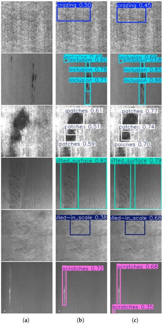 The incorporation of the AKConv module brought about a substantial increase in Precision (P), reaching 0.688. AKConv’s strength lies in its adaptive, variable convolutional kernel size and position, which allow it to dynamically adjust its receptive field based on the unique geometric structures of steel defects, such as the linear characteristics of cracks or the punctiform distribution of patches. This precise feature capture capability effectively enhances the model’s ability to recognize various defect morphologies. The introduction of the BiFPN module demonstrated outstanding performance in Recall (R), improving to 0.712. BiFPN leverages an innovative bidirectional weighted feature fusion mechanism to efficiently integrate feature information from multiple scales. This approach enables the model to comprehensively utilize both global contextual information and local fine-grained details, significantly boosting its recall rate for diverse defect types. The Detect_DyHead module contributed most comprehensively to the overall model performance, achieving the best results for both mAP50 and mAP50-95 metrics, reaching 0.745 and 0.410, in that order. Detect_DyHead enhances the detection head’s adaptability by dynamically optimizing across three orthogonal dimensions: scale, space, and channel. This adaptive adjustment capability ensures that the model can achieve more precise and robust predictions when handling complex and varied defects.