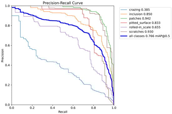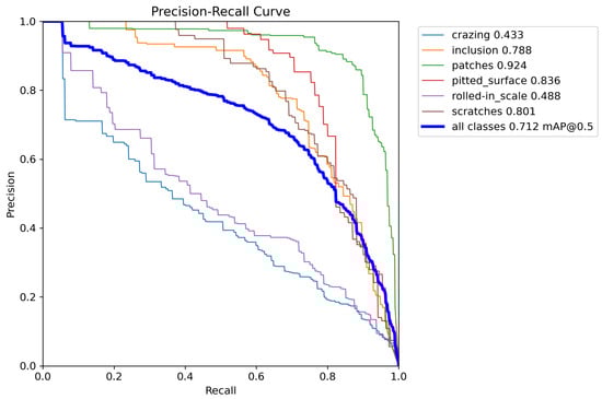 However, a notable exception is observed for CR defects, where the model’s performance, as depicted by its PR curve, shows a declining trend. This degradation is likely attributed to the challenges previously discussed, specifically the inherent similarity between the visual characteristics of crazing defects and the background’s color and texture distribution on the steel surface. Such visual ambiguity can hinder the precise extraction and fusion of geometric features, hindering the model’s ability to precisely distinguish these defects from their surroundings. This highlights a specific area where further refinement in feature learning for highly ambiguous defect types is warranted.