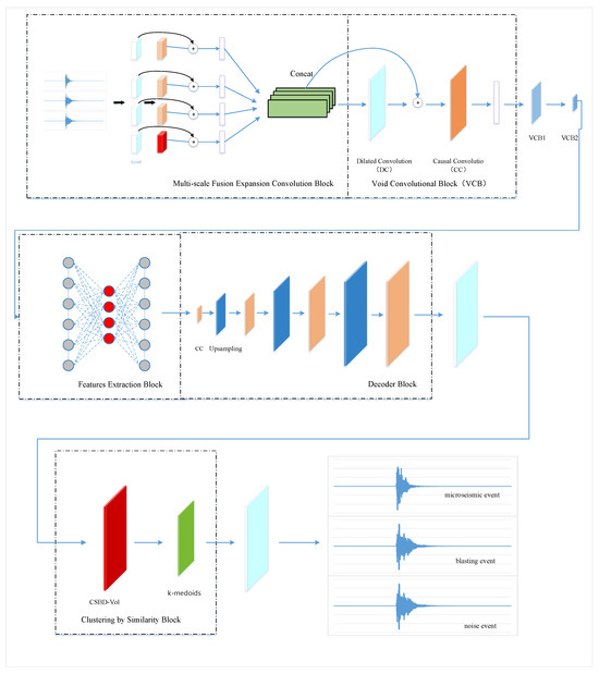 To improve the efficiency and accuracy of microseismic event extraction from time-series data and enhance the detection of anomalous events, this paper proposes a Multi-scale Fusion Convolution and Dilated Convolution Autoencoder (MDCAE) combined with a Constraint Shape-Based Distance algorithm incorporating volatility (CSBD-Vol). MDCAE extracts low-dimensional features from waveform signals through multi-scale fusion and dilated convolutions while introducing the concept of waveform volatility (Vol) to capture variations in microseismic waveforms. An improved Shape-Based Distance (SBD) algorithm is then employed to measure the similarity of these features. Experimental results on a microseismic dataset from the 802 working faces of a mining site demonstrate that the CSBD-Vol algorithm significantly outperforms SBD, Shape-Based Distance with volatility (SBD-Vol), and Constraint Shape-Based Distance (CSBD) in classification accuracy, verifying the effectiveness of constrained time windows and volatility in enhancing performance. The proposed clustering algorithm reduces time complexity from to , achieving substantial improvements in computational efficiency. Furthermore, the MDCAE-CSBD-Vol approach achieves 87% accuracy in microseismic time-series waveform classification. These findings highlight that MDCAE-CSBD-Vol offers a novel, precise, and efficient solution for detecting anomalous events in microseismic systems, providing valuable support for accurate and high-efficiency monitoring in mining and related applications.