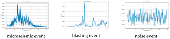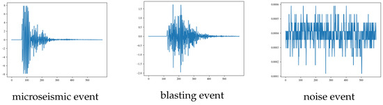 We used the microseismic monitoring data of the 802 working faces in a certain mining area, combined with the experimental dataset of the production cost. The microseismic data was collected by the equipment of the ground microseismic detection station, as shown in Figure 3 specifically. The sampling frequency of the microseismic monitoring data was 500 Hz. The experimental dataset contains 500 microseismic event waveforms, 500 blasting event waveforms, and 500 non-event waveforms (noise waveforms). Figure 4 and Figure 5 show the corresponding waveforms and spectrograms, while the time series diagrams are presented in Figure 6. The length of each data segment is 600, and the data is normalized by the maximum and minimum values.
