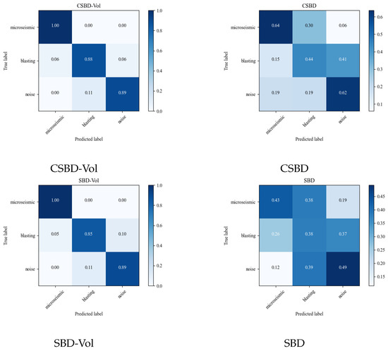 Confusion matrices for clustering results using CSBD-Vol, CSBD, SBD-Vol, and SBD.