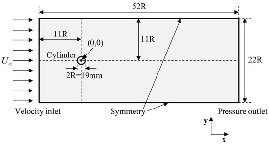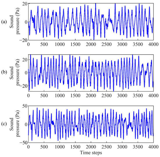 Referring to the experimental model conducted by Revell et al. [33], we employ ANSYS Fluent computational fluid dynamics (CFD) software with launcher version of 18.0.0 to perform numerical simulations of aerodynamic noise induced by flow around a circular cylinder, generating the dataset for model training and prediction. As is illustrated in Figure 2, a two-dimensional physical model of aerodynamic noise induced by flow around a cylinder is established. The cylinder has a diameter of 19 mm. On the left side, the velocity inlet is defined, while the right side is specified as the pressure outlet. The top and bottom sides are set as symmetry boundaries. The Smagorinsky–Lilly model of large eddy simulation is used, and the fluid medium is an incompressible ideal gas at a temperature of 300 K with a viscosity of 1.7894 × 10−5 kg/(m·s). The time series of aerodynamic noise is captured by a receiver positioned at (0, −0.665 m). Figure 3 shows sound pressure values collected in 3988 steps with inlet velocities of 60 m/s, 69.2 m/s, and 80 m/s. Among these cases, the one with an inlet velocity of 69.2 m/s and a Reynolds number of 90,000 is a classic case and has been widely used to validate and compare the performance of different methods and turbulence models. The high Reynolds number means it is at a turbulent state where the inertial forces significantly outweigh the viscous forces and result in a complex and unstable flow behavior, which poses significant challenges and provides an ideal benchmark for testing the accuracy and reliability of turbulence prediction models.