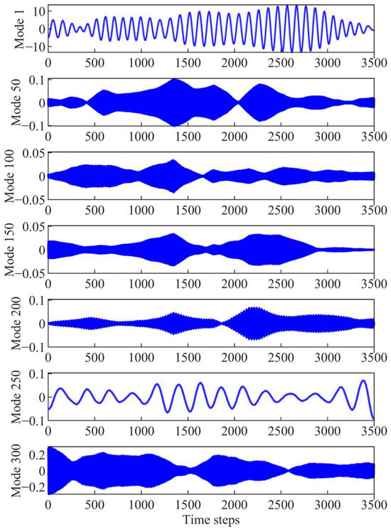 The time series is decomposed into 300 modes using VMD, as empirical testing reveals that this count optimally separates distinct physical processes without introducing artificial mode splitting or excessive computational burden, and the decomposition accuracy is set to . A subset of the modes obtained from VMD is shown in Figure 4. Within a small time interval, each mode can be regarded as a harmonic signal, which proves that the modes are narrowband signals with energy concentrated around the center frequency. The time series to be predicted becomes clearer and stationary after the decomposition, with noise isolated and system redundancy reduced.