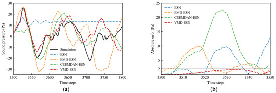 Prediction results of ESN, EMD-ESN, CEEMDAN-ESN, and VMD-ESN are compared in Figure 5. As shown in Figure 5a, it is observed that for the ESN model, deviation becomes clearly visible after about 25 time steps, and the model loses its ability to track the temporal evolution of the series over extended time steps. Both EMD-ESN and CEEMDAN-ESN broadly capture the oscillation patterns of aerodynamic noise time series within 300 time steps and track evolutionary trends more effectively than a single ESN. However, their prediction accuracy remains substantially limited. The results of the VMD-ESN model demonstrate that the prediction trend remains stable within the whole prediction time range, and good accuracy is achieved within 150 time steps. For the initial 50 time steps, as shown in Figure 5b, the absolute errors of the VMD-ESN model are consistently below 2 Pa, which are much smaller than those of other models.
