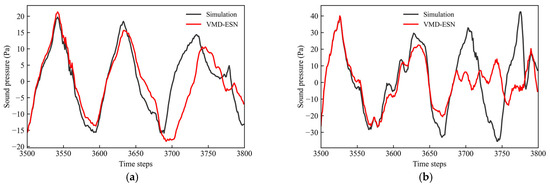 In the VMD-ESN method, sound pressure values of the first 3500 time steps of each subseries decomposed by VMD are used as the input vector to predict the value of the 3501st time step. When the first iteration is performed, the predicted output vector is substituted into the ESN as a new input vector for the next prediction epoch. Namely, the predicted sound pressure value at the 3501st time step, along with the preceding 3499 time steps, is then recombined into a new input vector. This updated input vector consists of the sound pressure values from the second time step to the 3501st time step. This process is repeated until predictions for all the set time steps are completed. All the prediction results are added up to obtain the final prediction result of the aerodynamic noise time series of flow around a cylinder. This rolling prediction strategy simulates the evolution process of the sound pressure time series of aerodynamic noise around a cylinder and maximizes the use of all available data for learning.