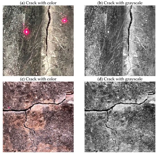 Image preprocessing is a fundamental component of deep learning applications in image analysis. The first preprocessing step in this study involved converting color images to grayscale. Since color images consist of red, green, and blue channels, converting them to grayscale, which contains only a single channel, significantly reduces data volume and computational demand. This reduction is especially beneficial in resource-constrained environments, as it enhances both training and inference efficiency. As highlighted by [], grayscale conversion improves numerical analysis reliability and enhances geometric representation in structural analysis. Simple preprocessing techniques, such as contrast enhancement, facilitate the extraction of crack features. Golding et al. [] demonstrated that color-independent features are crucial for crack detection in deep learning, suggesting that grayscale images can enhance model performance. In this study, grayscale conversion was applied to help models focus on essential crack features. Figure 1 illustrates crack patterns in images before and after grayscale conversion.