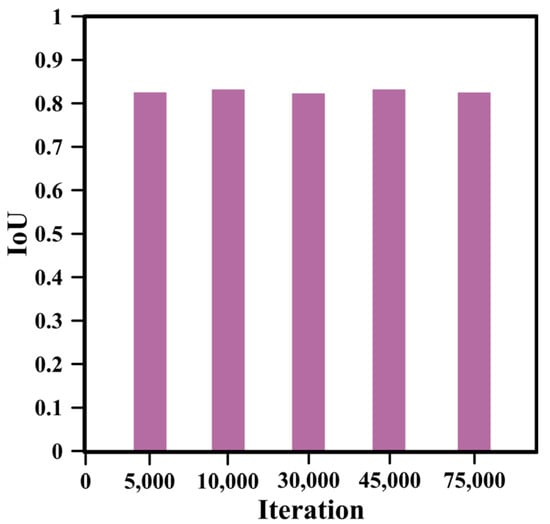 The model trained at 45,000 iterations was selected for further analysis, as it demonstrated the optimal trade-off between accuracy and generalization, achieving an Intersection over Union (IoU) of 0.832. To further assess the model’s generalization performance, an external dataset [] comprising 237 images was employed for validation. The resulting IoU of 0.726 suggests that, although the SegNet model exhibited reduced performance on external data compared to internal validation, it nonetheless maintained a reasonable level of predictive capability.