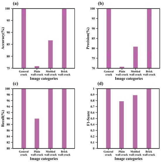 This subsection investigates the performance of the GoogleNet model across different iteration counts. A dataset of 66 images was used, consisting of 11 images of general wall cracks, 11 images of weathered wall cracks, 11 images of brick wall cracks, and 33 images without cracks. The model was trained and validated over 25, 50, 75, 100, and 125 iterations, with 70% of the images used for training and 30% for validation. To further evaluate the model’s performance, an additional set of 34 images (including six images each of general wall cracks, weathered wall cracks, and brick wall cracks, along with 16 images without cracks) was used for application analysis. The results were assessed using comprehensive evaluation metrics.