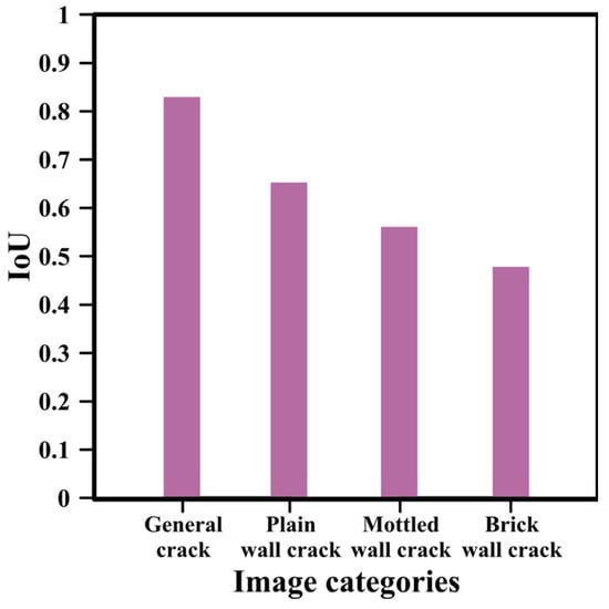 Conventional crack detection methods predominantly rely on expert visual inspections, often supported by manual measurements to determine crack dimensions and distribution. Although these methods are straightforward, they are inefficient for large-scale surveys and prone to subjectivity and human error. The measurement discrepancies among different inspectors have been reported to exceed 8% []. In contrast, the deviation between crack measurements obtained using deep learning-based methods and those acquired manually with measuring tools ranges from 0.4% to 5% []. Peta et al. [] employed a fractal theory-based approach to analyze heritage surfaces. This method effectively distinguishes surface features, such as impressions, cracks, and wear, at specific observational scales. To improve accuracy and efficiency, image processing techniques such as edge detection and thresholding have been employed. However, these methods often underperform in conditions with uneven lighting or complex backgrounds, necessitating manual adjustment for image preprocessing and parameter tuning [,].