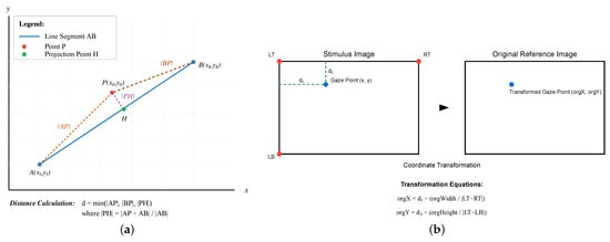 This study proposes a fixation point coordinate transformation method based on geometry, which relies on calculating the shortest distance between a point and a line segment while incorporating the precise derivation of vertical projection point positions. This method can handle various image transformation scenarios, including rotation, scaling, and perspective distortion, as illustrated in the coordinate transformation process shown in Figure 1b, while ensuring computational accuracy and flexibility. The following section provides a detailed description of the design and computational process of this method.