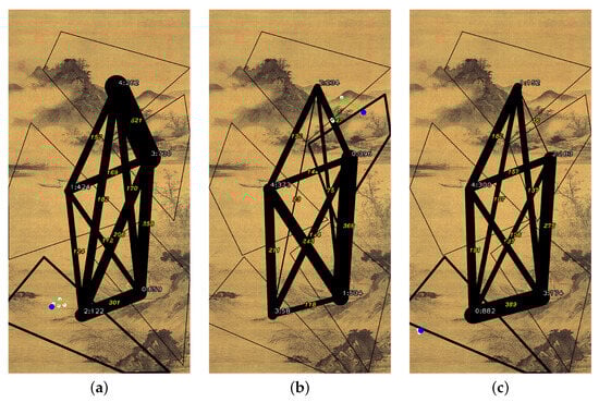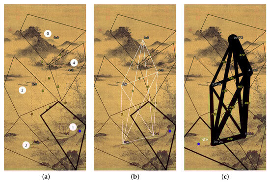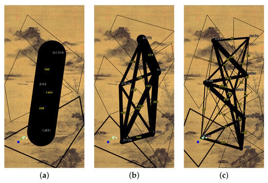 The concept of “weight” reflects how visual attention is distributed and concentrated across different regions. In this study, weight is operationally defined as the number of fixation points falling within each visual region, which is then used to calculate the relative proportion of attention during the overall viewing process. This spatially based approach highlights how attentional resources are distributed among different areas, without assuming a direct relationship with cognitive load or task difficulty. Locher [] noted that observers often form an initial holistic impression of an artwork and then direct their attention toward specific regions for deeper exploration. Fixation duration and location are related to task-specific processing strategies, indicating that the spatial distribution of gaze reflects the viewer’s intentions and interpretive focus, e.g., Schwetlick et al. [] and Vasilyev []. These studies suggest that the visual field is not processed evenly; rather, some areas receive greater attentional emphasis due to their visual saliency or perceived informational value. Based on this perspective, this study calculates weight through the count of fixation points per region, providing a structured representation of how attention is distributed spatially. Unlike conventional heat maps that simply show fixation density, our weight-based approach distinguishes between central focal areas and transitional nodes, revealing the hierarchical organization underlying visual attention. This measure serves as a foundation for subsequent spatial analysis and the modeling of interregional relationships that illuminate the cognitive architecture of structured viewing.