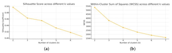 Validation curves showing (a) silhouette coefficient and (b) within-cluster sum of squares (WCSS) across –7, supporting the trade-off choice of .