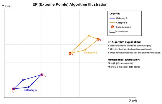 This study applies the Extremum Points (EPs) algorithm to construct geometric representations of fixation distributions for analyzing the spatial distribution characteristics of fixation points. The algorithm processes the classified set of fixation points , where , and identifies four key extremum points to construct boundaries: