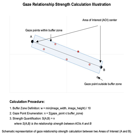 In eye-tracking research, quantifying the relationships between Areas of Interest (AOIs) is essential for understanding users’ visual behavior. With advancements in research, effectively handling AOI transition regions and accurately quantifying relationship strength have become critical issues in static scene analysis. Early studies primarily quantified relationship strength based on the distance between AOIs or the frequency of fixation point transitions. For example, Kang et al. [] proposed the Area Gap Tolerance (AGT) method, which evaluates the association between AOIs by setting a fixed tolerance range. Although this method is intuitive, it struggles to accurately capture transitional relationships between AOIs in dense AOI distributions or complex visual scenes. Additionally, it does not account for the dynamic distribution of visual attention, and thus, potentially overlooks subtle visual flow patterns between AOIs. Kübler et al. [] introduced an analysis framework based on a buffering mechanism, specifically addressing the handling of overlapping AOI regions. They found that adaptive buffer zones enhance AOI relationship identification. However, this method faces computational efficiency challenges, particularly when processing large-scale data, as buffer zone settings may increase computational costs. Therefore, improving computational efficiency while maintaining accuracy remains a key research challenge. Loyola and Velásquez [] introduced a graph-based analytical framework, treating AOIs as nodes and measuring relationship strength through fixation transition frequencies. While this method captures the flow patterns of visual attention, it focuses on node connections and does not directly consider the spatial distribution of AOIs. Instead of a graph-based method, Rim et al. [] proposed the Point-of-Interest (POI) approach, which describes visual attention distribution using a gradual transition method, overcoming the rigid boundary constraints of traditional AOI methods. However, when fixation point distributions are scattered, this method may fail to accurately capture visual attention flow relationships. Regarding the representation of relationship strength, Constantinides et al. [] explored the distribution characteristics of visual attention from a statistical modeling perspective and used numerical calculations to estimate relationship strength. However, they did not provide an intuitive visualization tool to illustrate the strength of relationships between AOIs, making it challenging to interpret results in applied contexts. Although these studies provide an important foundation for AOI analysis, several key challenges remain in relationship strength quantification, including how to adaptively adjust the analysis range based on different stimulus scenes, how to integrate spatial and temporal dimensions into relationship strength representations, and how to provide more intuitive visual representations. Particularly in dynamic scenes, accurately capturing the flow of visual attention between AOIs while considering the influence of temporal variations remains a pressing issue. From a cognitive perspective, the visual connections between AOIs reflect more than spatial adjacency or transition frequency—they represent the viewer’s exploratory strategies and the internal structure of attentional shifts. According to Alexander, Nahvi, and Zelinsky [], the precision of guiding features plays a central role in visual search by shaping saccadic targeting and influencing the allocation of attention. By quantifying these inter-AOI relationships, researchers can infer how viewers navigate scenes, prioritize diagnostic information, and construct task-relevant visual pathways. To address these challenges, this study focuses not only on the fixation characteristics of individual AOIs but also on the visual relationship strength between AOIs. We propose an adaptive buffer zone analysis method, which quantifies relationships by computing the visual connection strength between AOIs. Although this method involves additional computational cost, as noted earlier, it was selected for its ability to more precisely capture spatial transitions between AOIs. The data scale in this study remains manageable, and the accuracy of spatial modeling was prioritized. This method does not alter the original AOI boundaries but instead identifies visual attention flow trends through inter-block connection patterns. Additionally, by mapping relationship strength using line width, the visual attention flow patterns become more intuitively visible. The next chapter details the computational process and application examples of this method.