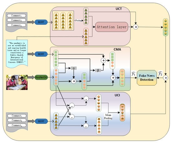 In recent years, with the widespread application of multimodal learning in information retrieval, its advantages of leveraging multiple data sources for complementary information have become increasingly prominent [,]. From image–text matching to video captioning and sentiment analysis, multimodal methods have significantly improved task performance by extracting and fusing features from different modalities [,]. In this context, extending multimodal learning to the fake news detection domain, particularly utilizing user comments as a key modality for analysis to improve accuracy in identifying fake news through social signals, holds significant research value and practical importance [,].