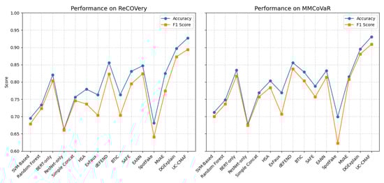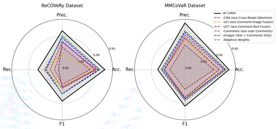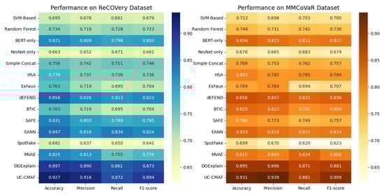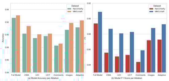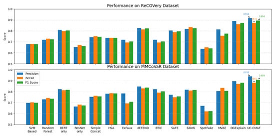 Both ReCOVery and MMCoVaR are centered around COVID-19-related misinformation, which may introduce topic-specific linguistic, visual, and social biases. For instance, common text tokens (e.g., “vaccine,” “clinical trial”) and visual patterns (e.g., medical diagrams or bar charts) may dominate feature learning, while user comments tend to reflect highly polarized or emotionally charged discourse. As a result, the model may learn domain-specific representations that do not generalize well to topics such as politics, finance, or AI-generated content. However, the modular design of UC-CMAF—including separate CMA, UCI, and UCT components—allows for efficient adaptation to new domains via fine-tuning without altering the core architecture. Future work should evaluate the framework on a broader range of datasets, such as PolitiFact or GossipCop, to systematically assess its robustness across diverse semantic and visual distributions.