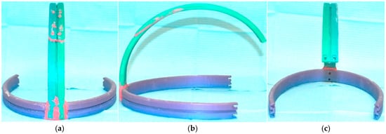 The original model was simplified by removing all components and leaving only the head support structures (Figure 1). This was done using Fusion 360 (Version 2.0.19440, Autodesk Inc., San Francisco, CA, USA). Three arms were created that conformed to the shape of the head and allowed the placement of three reference sensors in a distribution similar to that achieved when they are placed on the skin (glabella and left and right mastoid processes) (Figure 2). The lateral arms consist of a single piece (Figure 2a), while the upper arm was printed separately (Figure 2b) due to the printer’s size limitations. Additionally, a guide channel was created to allow each sensor cable to adapt smoothly to the shape of the helmet (Figure 2c). These modifications were made using Tinkercad (Autodesk, Inc. San Francisco, CA, USA). The final STL file was created with Fusion 360.