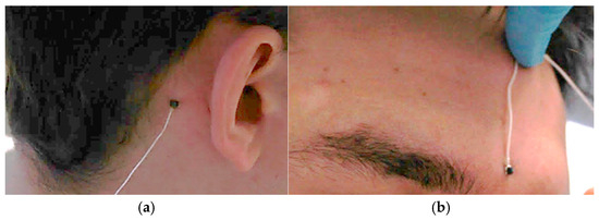 Reference sensors attached to the skin of patient. (a) Mastoid process. (b) Glabella.