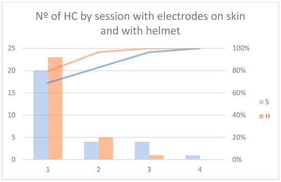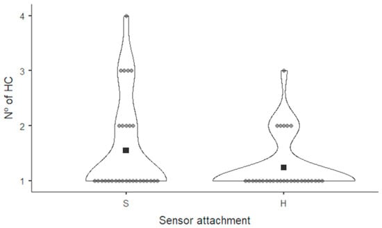 Figure 7 shows the frequency diagram of number of HC procedures performed in each recording session with the sensors placed on the subject’s skin (S) and those placed on the helmet (H). Twenty (69%) sessions with the reference sensor on skin required only one HC, four (14%) required two and three HC, and one (3%) required four HC. When sensors were placed on the helmet, 23 (79%) required 1 HC, 5 (17%) sessions required 2 HC and 1 (3%) required 3 HC. The descriptive measures for each group were as follows: in the group without the helmet, the median was 1.5 (range: 1–4), while in the group with the helmet, it was 1.2 (range: 1–3). No statistically significant differences were found between the groups (p > 0.05). Figure 8 shows a violin graph summarizing these data.