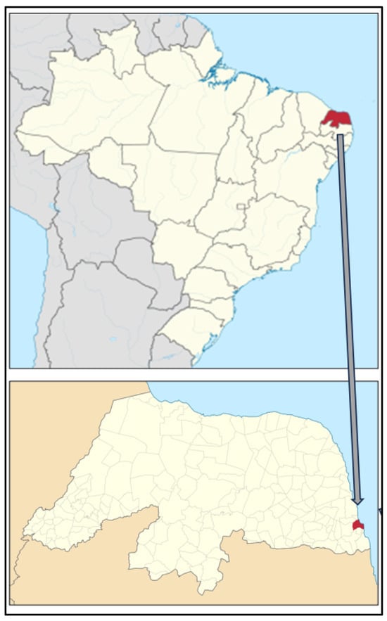The green algae were sourced by Primar Aquacultura, an organic shrimp and oyster farm located in Tibau do Sul, RN, Brazil (Latitude: 6°13′30″ S, Longitude: 35°08′20″ W). The algae were collected between October 2022 and January 2023, before recapping the culture tanks after an average cultivation cycle of 55 to 60 days. This study used green macroalgae that naturally proliferate in aquaculture ponds as a secondary biomass stream (by-product) during the cultivation of shrimp and oysters. The ponds had an average salinity of 33 ppt in October and 28 ppt in January and an average temperature of 27.5 °C in October and 29 °C in January. The green algae were identified to the species level as Ulva flexuosa (Department of Oceanography and Limnology, Federal University of Rio Grande do Norte-UFRN, Brazil). The green macroalgae collected in this study were taxonomically identified based on morphological characteristics visible to the naked eye and under a stereomicroscope equipped with an ocular micrometer. Diagnostic features such as thallus shape, blade margins, cell arrangement, and rhizoidal structures were evaluated. Identification was conducted using specialized taxonomic keys for green macroalgae. Specifically, the samples were identified as Ulva flexuosa using the dichotomous key provided by Barata []. Figure 1 shows the geographic map where the green macroalgae were collected.