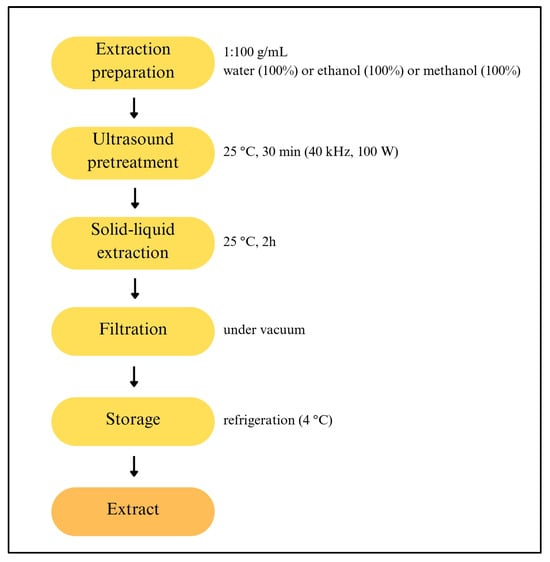 The extracts were prepared following Correia et al. [] and Kumar et al. [] with modifications as shown in Figure 3. For performance comparison, three different solvents were used in this study: water, ethanol, and methanol. A w/v ratio of 1:100 g/mL (UODP/solvent) was applied for all experiments. All extraction protocols were conducted using ultrasound-assisted solid–liquid extraction (UAE). Briefly, UAE (Altsonic, Clean 3IA 3 L, North Salem, NY, USA) was conducted for 30 min at 40 kHz and 100 W, followed by continuous magnetic stirring (SP Labor, SP-10209/A, Presidente Prudente, SP, Brazil) at room temperature (25 °C) for 2 h. After that, the material was filtered under vacuum (Solab, model SL 61, Recife, PE, Brazil) using filter paper (Whatman n° 1) and stored under refrigeration (4 °C) until further analyses.