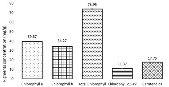 The chlorophyll a (chl. a), chlorophyll b (chl. b), total chlorophylls, chlorophyll c1 + c2, and carotenoids were calculated using the Equations (1)–(5) described by Palaniyappan et al. [].