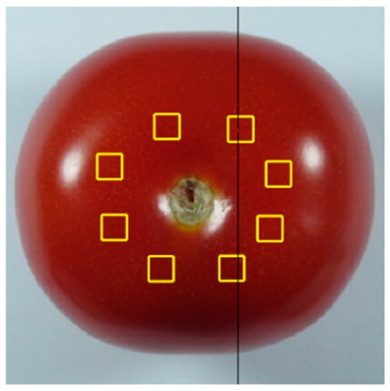 For image analysis of tomato samples, an already published methodology of our group was followed []. Briefly, three color parameters (L*, a*, and b*) were derived from the colored images, while fifteen textural features were extracted from the grayscale versions. These features were used to analyze the color and textural changes in tomatoes throughout the study. To extract the relevant features, a series of regions of interest (ROIs) (Figure 2) were selected from each image of all samples around the tomato stalk region, and saved as 21 × 21 pixels color images in BMP format, using the approach previously described by Ladika et al. (2024) []. The software’s design involved the use of the Python programming language and employing image processing functions from the scikit-image image processing library (https://scikit-image.org/ (accessed on 9 December 2024)). The colored version of the stored ROIs was used to produce the L*a*b* features, while the grayscale version of the ROIs was used to generate the textural features.