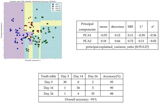 Scatter diagram, principal component, and truth tables of the tomato peel samples discrimination, employing the textural features, among days 3, 14, and 24.