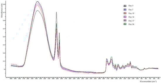 An overlay of each storage day’s representative ATR–FTIR spectra of tomato peels.
