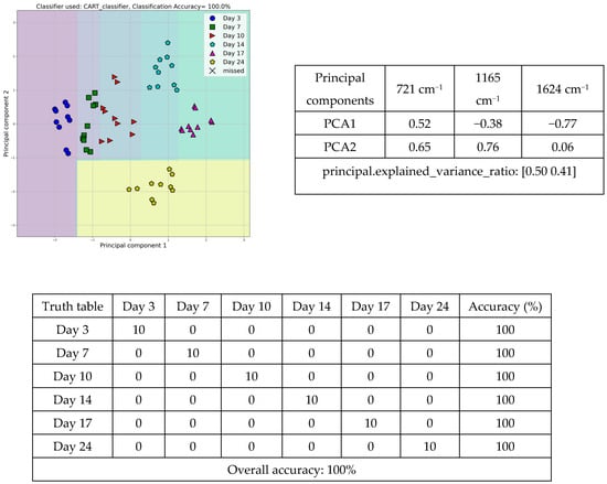 Additionally, the tomatoes were grouped according to the different storage days using the intensities of the spectral bands at 721, 1165, and 1624 cm−1, achieving a discrimination accuracy of 100.0%. The scatter diagram (Figure 6) shows, the correct classification of all samples on days 3 (blue circles), 7 (green squares), 10 (red triangles), 14 (pine green pentagons), 17 (purple triangles), and 24 (yellow pentagons). All samples were correctly classified by the machine learning CART classifier.