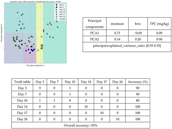 Scatter diagram, principal component, and truth tables of the discrimination among tomato samples at days 3, 7, 10, 14, 17, and 24, employing the physicochemical parameters of tomato flesh.
