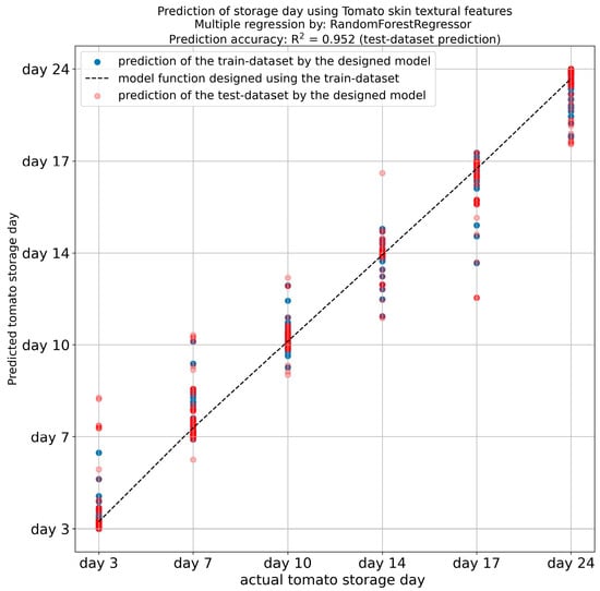 Furthermore, regression analysis was conducted using image-derived features, employing the Random Forest Regressor to predict the storage duration of tomatoes and the Gradient Boosting Regressor to estimate physicochemical properties such as moisture, firmness, and antioxidant/antiradical activity. To develop the regression models, 70% of the dataset was randomly allocated for training, while the remaining 30% was used for validation. Various feature combinations were tested, with a maximum of six features (representing 10% of the dataset size) included in each model. The approach ensured that the model with the highest predictive accuracy, evaluated through the R2 score, was selected.