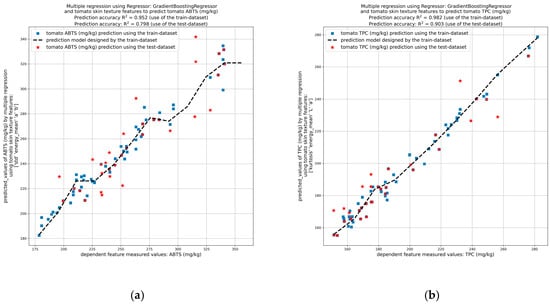 The features that exhibited the highest R2 (R2 > 0.952), were identified as being long-run emphasis (LRE), correlation, angular second moment (ASM), RLN, skewness, and RP (Figure 8). The findings demonstrated that the storage duration of tomato samples can be accurately predicted using a gradient-boosting regression model that was trained using the extracted features of tomato peel images. This finding aligns with the results of similar studies conducted by our research team and other researchers [,,,,], who have investigated various vegetable products. The findings underscore the importance of leveraging machine learning methodologies, underpinned by image texture and instrumental analysis outcomes, to ensure the conservation of vegetables and fruits.